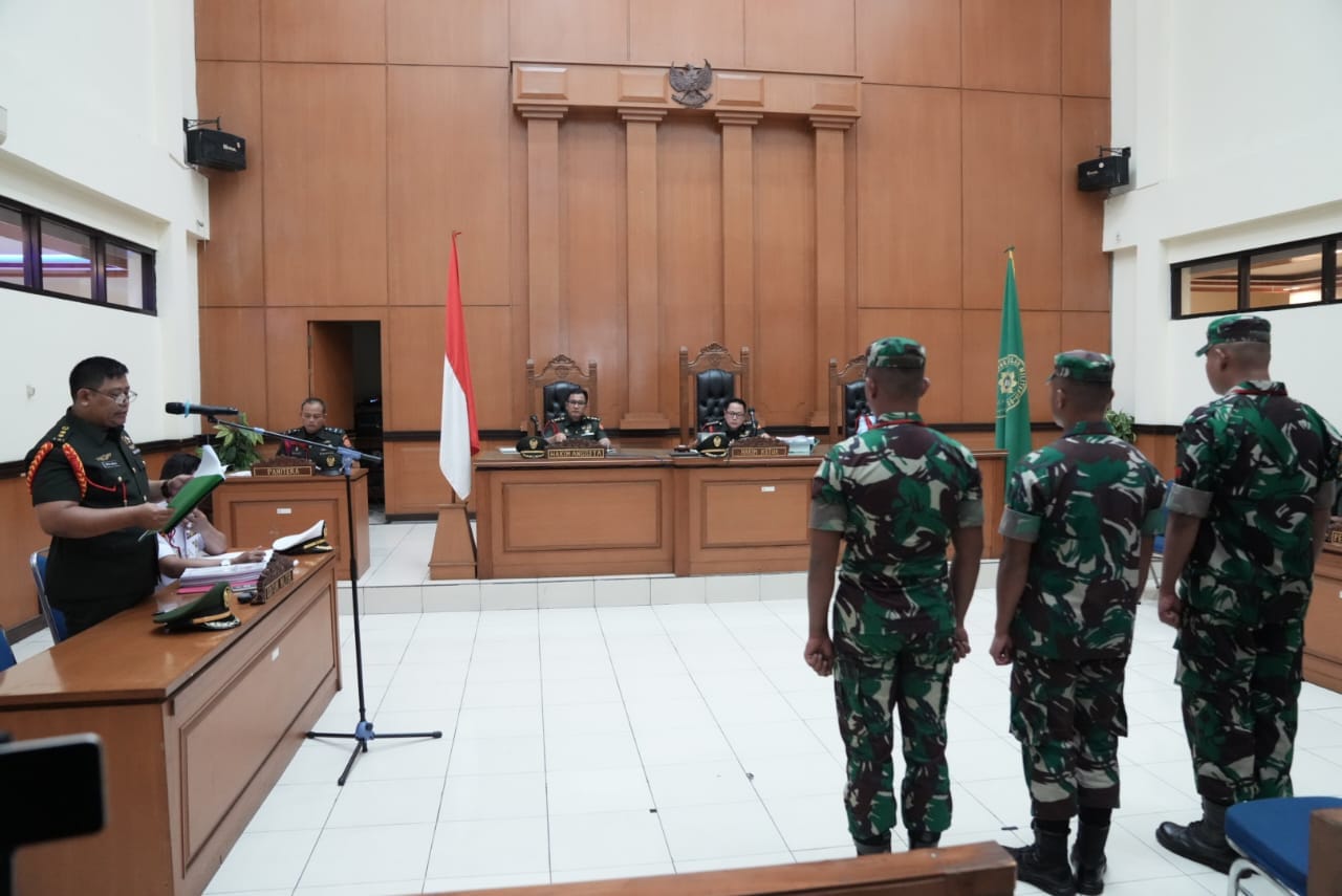 Kemudian sidang tersebut dipimpin oleh Hakim Ketua Kolonel Chk Rudy Dwi Prakamto, SH., Hakim Anggota Letkol Chk Idolohi, SH., dan Hakim Anggota Mayor Kum Aulisa Dandel, SH., dan Penasehat Hukum para terdakwa antara lain: Mayor Chk Manang, SH., Kapten Chk Budianto, SH., Lettu Chk Amril Harahap, SH.