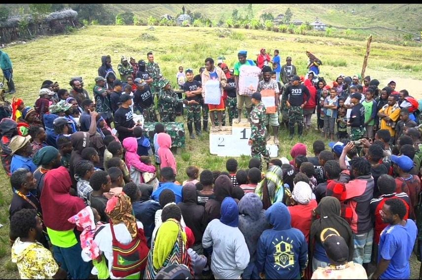 IPNews Lanny Jaya. Personel Satgas Yonif Mekanis 203/AK menghimbau kepada masyarakat Pegunungan Tengah untuk hidup sehat dengan ikut berpartisipasi dalam perlombaan bola volly yang diselenggarakan di Lapangan Volly Desa Lowanom, Distrik Malagayneri, Kabupaten Lanny Jaya, Jumat (03/02/2023).