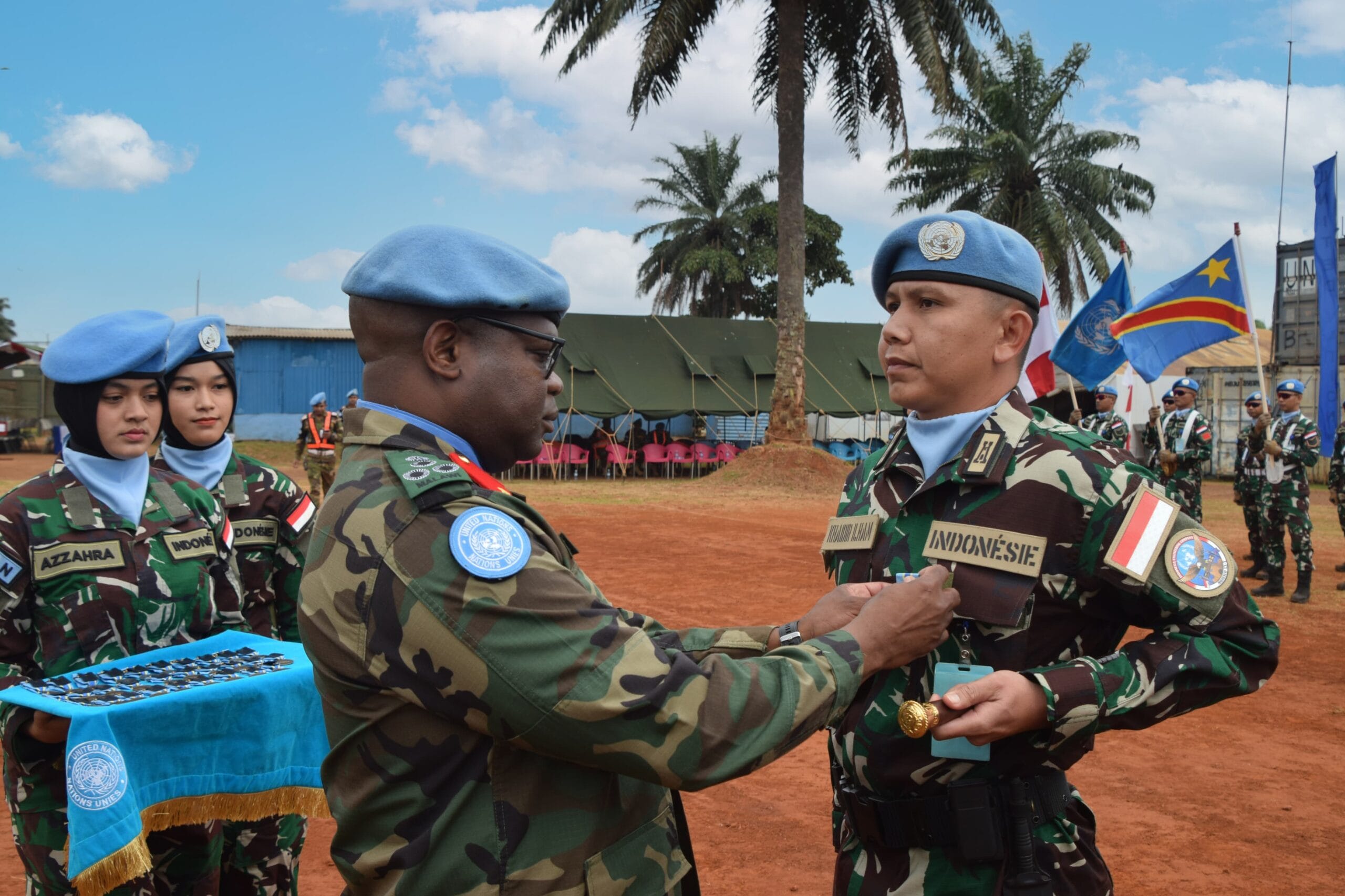 Prosesi upacara penganugerahan UN Medal bertempat di Bumi Nusantara Camp, Mavivi – Democratik Republik Congo (DRC), Kamis (15/02/2024). Upacara ditandai dengan penyematan secara simbolis dari Force Commander Monusco diwakili oleh Komandan Force Intervention Brigade (FIB) Brigadier General Alfred Luciano Matambo kepada perwakilan personel Satgas Kizi TNI Konga XX-T Monusco.