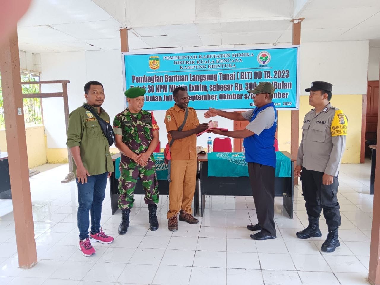 IPNews. Timika. Anggota Koramil 03/Kuala Kencana Kodim 1710/Mimika, Kopda Arif Teguh melaksanakan pendampingan pada kegiatan penyaluran Bantuan Langsung Tunai (BLT) Dana Desa kepada warga, bertempat di Balai Kampung Bhintuka SP 13, Distrik Kuala Kencana, Kab. Mimika. Rabu (10/01/2024).