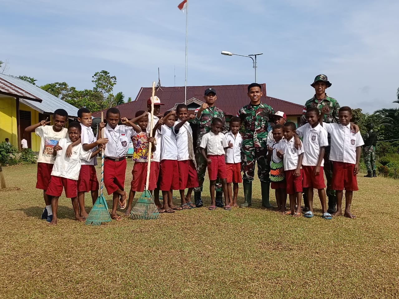 IPNews. Keerom. Dalam rangka mengajarkan kepedulian terhadap kebersihan lingkungan sejak usia dini, prajurit Satgas Pamtas Yonif 126/KC Pos Yuruf mengajak para murid untuk membersihkan sekolah SD YPPK Yuruf-Amgroto, Distrik Yaffi, Kabupaten Keerom.