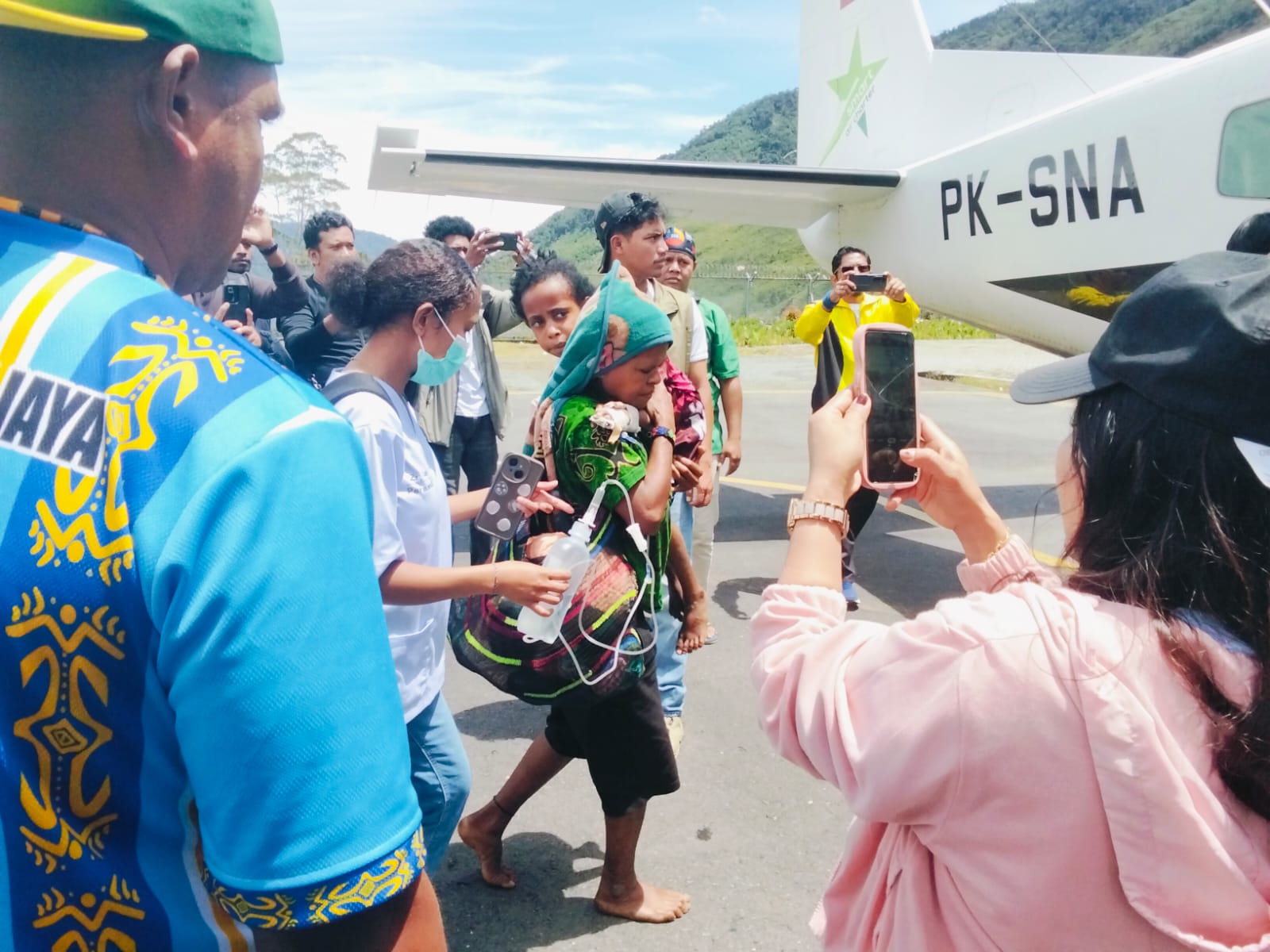 IPNews. Papua Tengah. Aparat keamanan bersama tenaga medis menevakuasi anak berusia 6 tahun, warga asal Distrik Sinak, Kabupaten Puncak, Provinsi Papua Tengah. Evakuasi anak perempuan yang menjadi korban dari aksi kekerasan kelompok bersenjata dilakukan pada Sabtu, (18/4/2026), pukul 11.28 hingga 11.50 WIT di Bandara Mulia, Distrik Muara, Kabupaten Puncak Jaya, menggunakan pesawat Smart Aviation PK-SNA dengan tujuan Bandara Douw Aturure, Nabire.