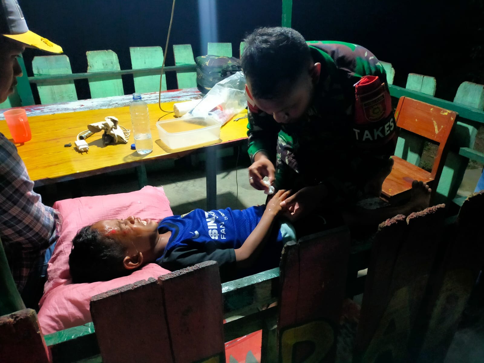 “Pada saat selesai Sholat Isya, tiba-tiba ada warga datang ke Pos dengan panik. Setelah kami lihat ternyata ada anak kecil yang terluka, seketika itu juga saya perintahkan Pratu Allan selaku Takes Pos untuk segera memberikan pertolongan pertama, beruntung luka yang dialami tidak terlalu parah. Setelah dibersihkan dan diberi antibiotik pada bagian kepala, wajah, dan tangan, kami tutup luka tersebut dengan perban supaya tidak mudah kotor,” ucap Danpos.