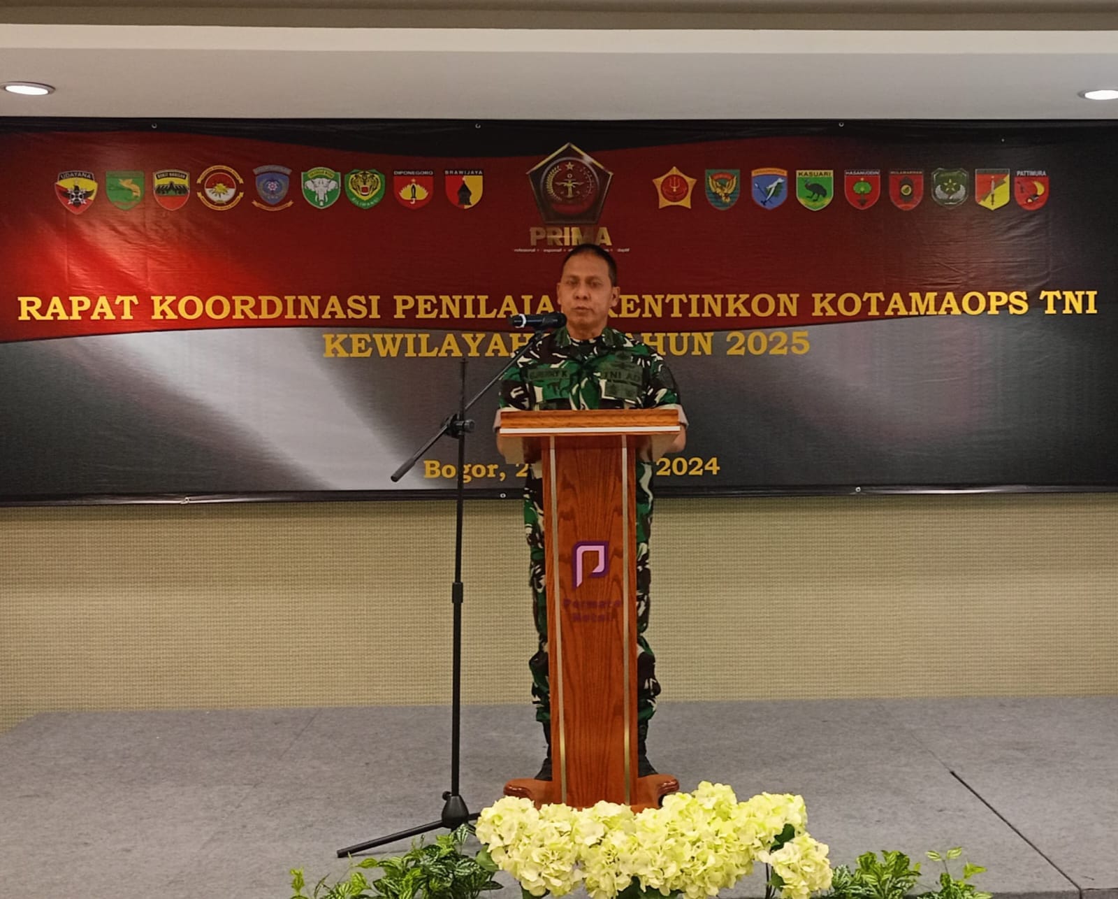 IPNews. Bogor. Asisten Operasi (Asops) Panglima TNI yang diwakili oleh Paban II/Orstra Sops TNI, Kolonel Laut (P) Donny Suharto, S.H., M.Tr.Opsla membuka kegiatan penilaian Rencana Kontigensi (Rentinkon) Kotamaops TNI Kewilayahan untuk tahun 2025, di Permata Bogor, Jawa Barat, Kamis (25/07/2024).