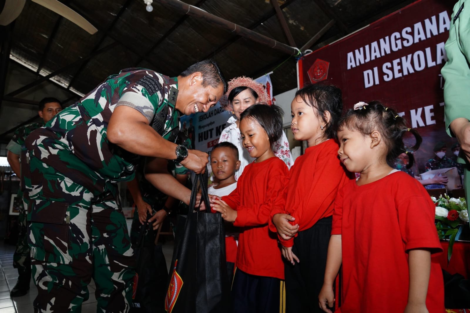 Sebanyak 100 paket sembako dan makanan gratis dibagikan kepada anak-anak Sekolah Darurat Kartini dan masyarakat sekitar, sebagai wujud kepedulian yang tulus dan dukungan untuk meringankan beban mereka. “Kita berbagi rasa kepada mereka-mereka untuk ikut turut berbahagia di Hari Ulang Tahun TNI Ke-79, ini bagian kepedulian kita, kalau masyarakat senang pastinya TNI akan turut senang,” pungkas Mayjen Novy Helmy Prasetya.