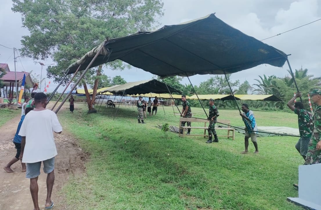 IPNews. Keerom. Personel Pos Yuruf Satgas Pamtas Yonif 126/KC bersama jemaat dan masyarakat bebondong-bondong kembali melaksanakan karya bakti guna mempersiapan acara Pentabisan Imamat Gereja baru atas nama Pastor Soter Pangguem putra asli Kampung Yuruf yang pertama di angkat menjadi Pastor dan akan dilaksanakan di Gereja Santa Maria Bunda Allah Yuruf-Amgotro, Kampung Yuruf, Distrik Yaffi, Kabupaten Keerom, Papua.