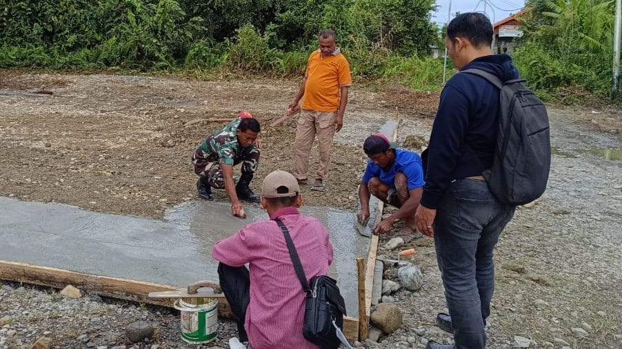 IPNews. Timika. Babinsa Koramil 02/Timika Kodim 1710/Mimika, Sertu Rusdin Wali bersama warga desa melakukan kerja bakti pembuatan sarana olahraga lapangan bola voli di Kampung Mawokau Jaya, Distrik Wania, Kab. Mimika. Rabu (10/7/2024).
