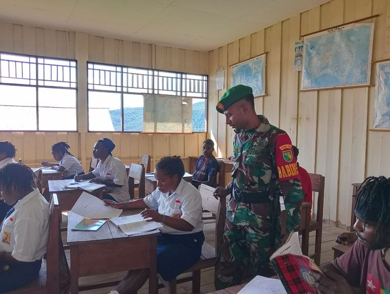 IPNews. Timika. Mendukung perkembangan pendidikan di wilayah binaannya, Babinsa Koramil 1710-05/Jila dipimpin Sertu Rusef membantu pengawasan ujian semester ganjil di SD Inpres Jila, Senin (31/10/2022). Kegiatan ini dilakukan karena peran pengawasan sangat penting dalam setiap ujian dimana melalui pengawasan seluruh peserta ujian akan bekerja secara objektif dan jujur.