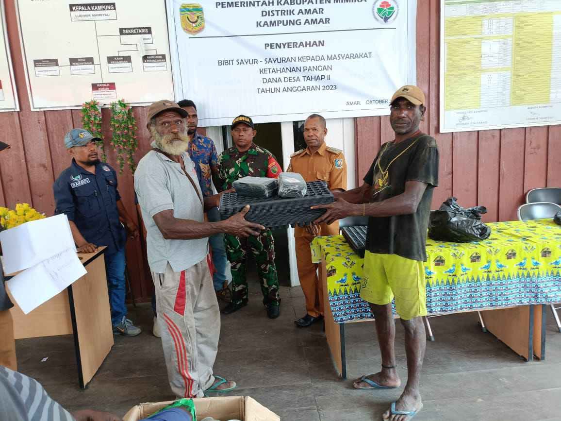 IPNews. Timika. Bertempat di Balai Kampung Amar, Distrik Amar, Kabuapten Mimika, Babinsa Koramil 1710-01/Kokonao Sertu Romanus Roflababin melaksanakan pendampingan penyaluran Bantuan Langsung Tunai (BLT) Tahap II TA. 2023, bantuan mesin jonson 15 PK, mesin sensor dan bibit sayuran kepada warga masyarakat, Senin (16/10/2023).