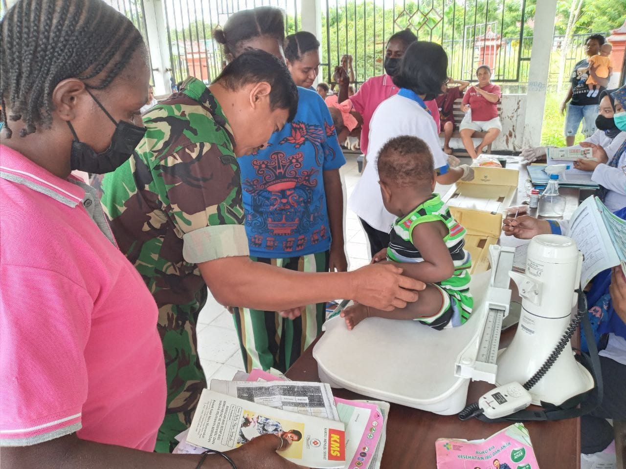 IPNews. Timika. Dukung program kesehatan pada bayi dan balita, Babinsa Koramil 1710-07/Mapurujaya, Sertu Slamet Riyadi melaksanakan pendampingan kegiatan Posyandu pada bayi, balita dan ibu hamil yang bertempat di Posyandu Kampung Kaugapu, Distrik Mimika Timur, Kabupaten Mimika, Rabu (10/01/2024).