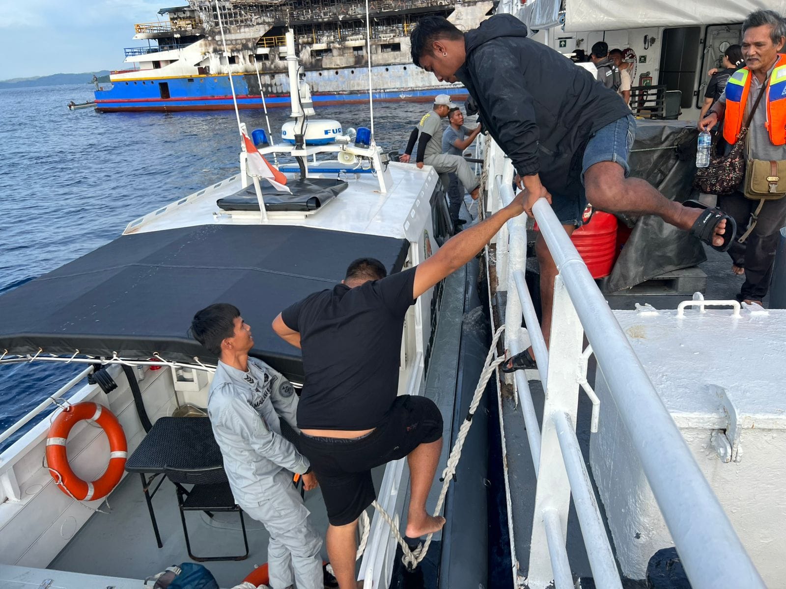IPNews. Manado. Bakamla RI melalui unsur KN Gajah Laut-404 dan HSC 32-03 melakukan aksi cepat tanggap darurat dalam membantu proses evakuasi penumpang KMP Barcelona 5 yang mengalami musibah kebakaran di perairan Pulau Talise, Kecamatan Likupang Barat, Kabupaten Minahasa Utara (Minut), Minggu (20/7/2025).