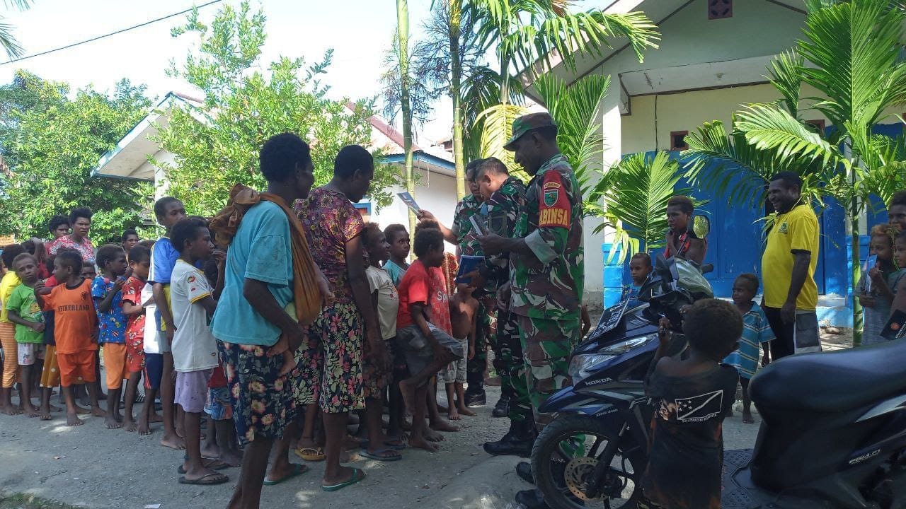 IPNews. Timika. Babinsa Koramil 1710-07/Mapurujaya dipimpin Serda Yulius Nampe memberikan bantuan alat tulis kepada anak-anak sekolah di wilayah binaan Kp. Kaugapu Distrik Mimika Timur, Kab. Mimika, Kamis (5/01/2023).