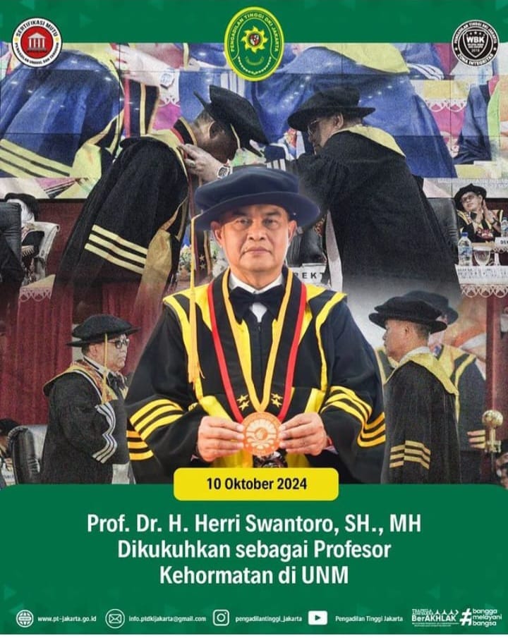 Dapat diangkat sebagai Profesor Kehormatan. “Jadi alasan UNM mengangkat Prof., Dr.,Swantoro,SH,MH, Sebagai Guru Besar Kehormatan tidak terlepas dan Kontribusinya yang signifikan dalam Dunia Peradilan, Beliau adalah Guru Besar Keenam di UNM Ke 24 di Indonesia” dilansir diistragram PT DKI diizinkan Senin (21/10/2024/.)