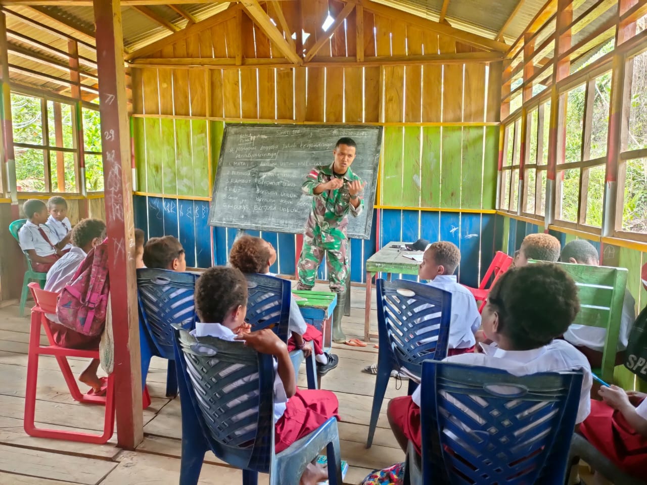 IPNews. Keerom. Meningkatkan motivasi dan semangat belajar generasi muda di perbatasan, Satgas Yonif 126/KC Pos Tatakra berikan bantuan sebagai tenaga pendidik di SD Inpres Fafinimbo Kampung Tatakra, Distrik Web, Kabupaten Keerom.