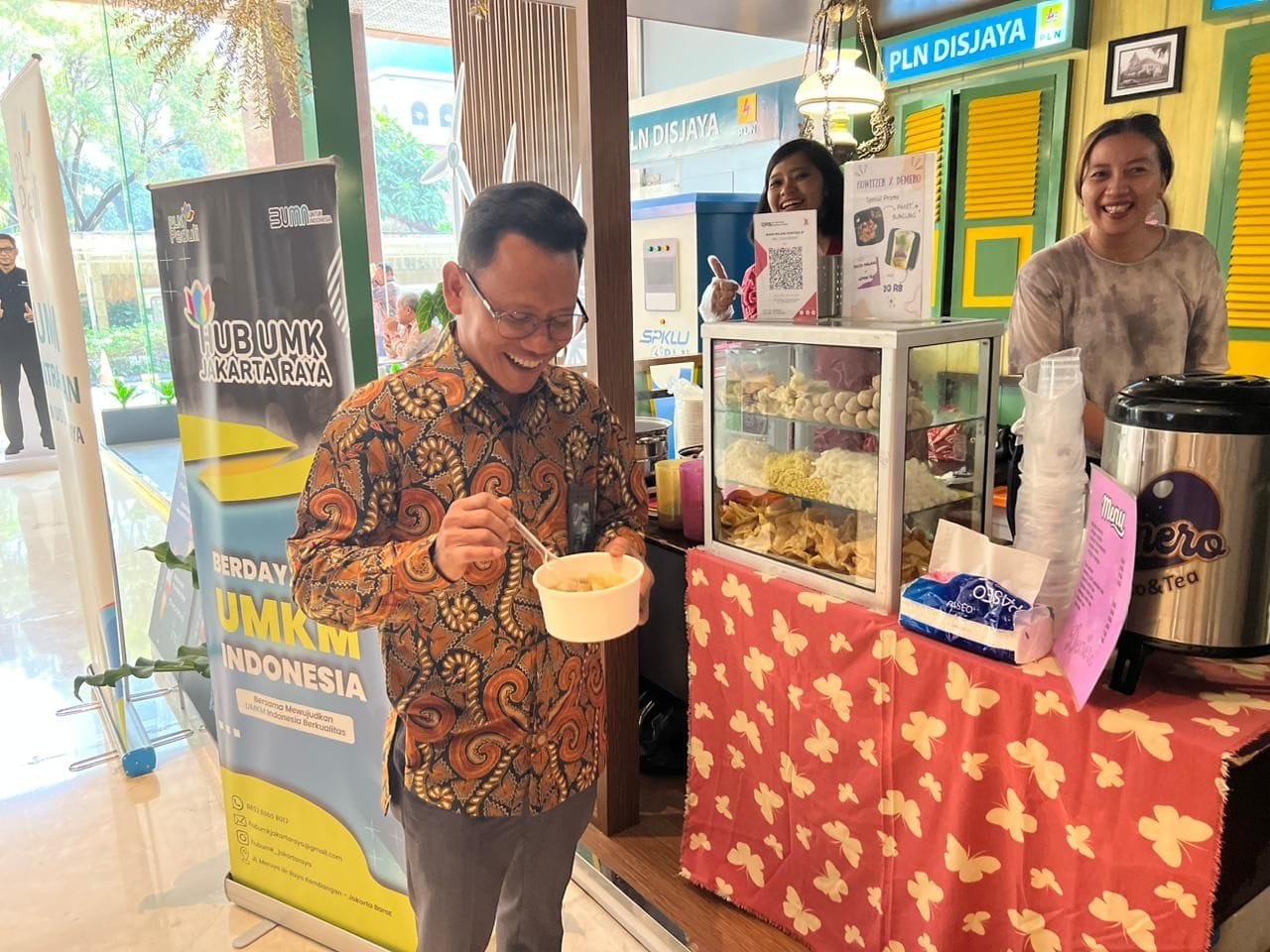 General Manager PLN UID Jakarta Raya, Lasiran, saat mencicipi produk UMKM binaan Hub UMK Jakarta di TJSL Day PLN UID Jakarta Raya.