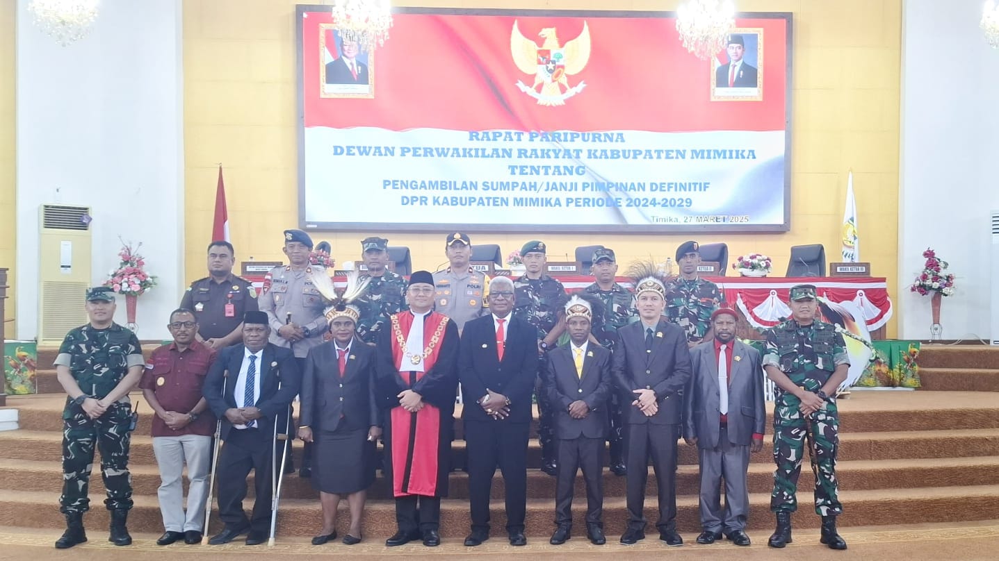 IPNews. Timika. Komandan Kodim 1710/ Mimika, Letkol Inf M. Slamet Wijaya, S. Sos., M. Han., M.A. menghadiri Rapat Paripurna dalam rangka Pengambilan Sumpah/Janji Pimpinan Definitif DPRK Mimika periode 2024-2029, yang berlangsung di Ruang Rapat Paripurna DPRD Mimika, Jalan Cendrawasih. Kamis (27/3/2025).