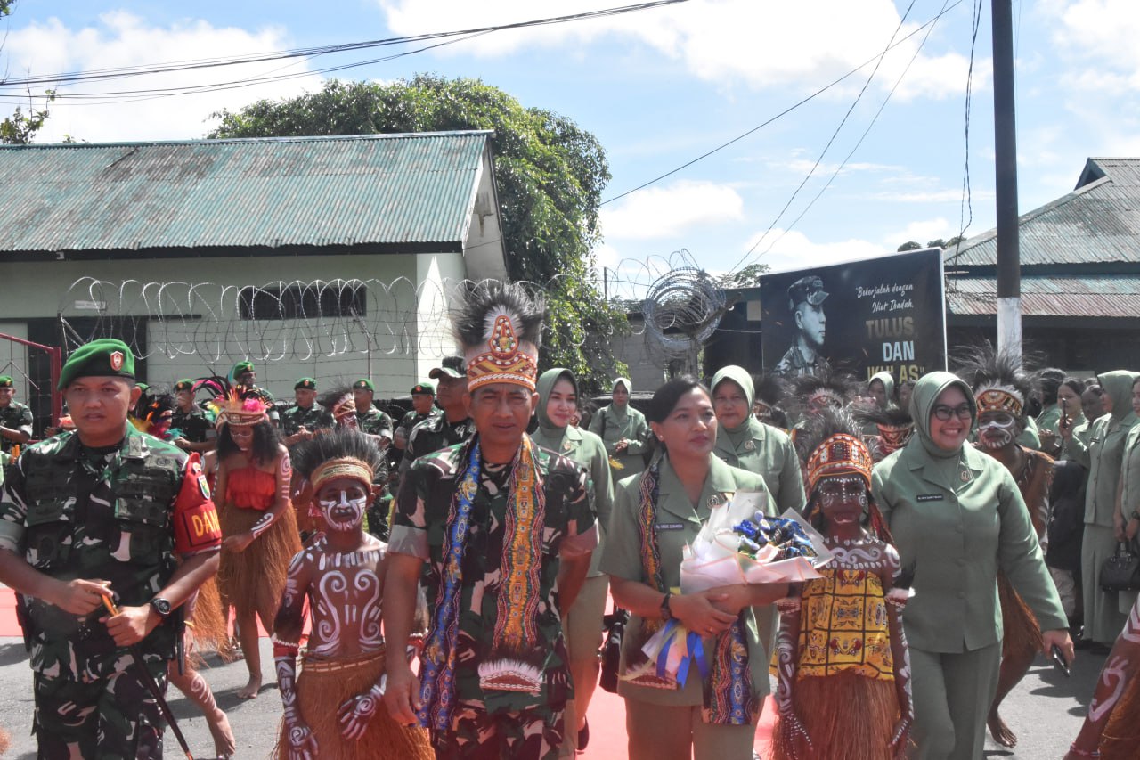 IPNews. Timika. Dandim 1710/Mimika Letkol Inf M. Slamet Wijaya, S.Sos ,.M.Han,.M.A. menyambut kedatangan Komandan Korem 173/PVB Brigjen TNI I Ketut Mertha Gunarda beserta Ibu saat melaksanakan kunjungan kerja ke Kodim 1710/Mimika, Senin (15/12/2025). Setibanya di gerbang Makodim 1710/Mimika, kegiatan diawali dengan acara penyambutan Danrem beserta Ibu yang dipimpin langsung oleh Dandim 1710/Mimika dilanjutkan Jajar Kehormatan oleh tim Jaga Kesatrian.