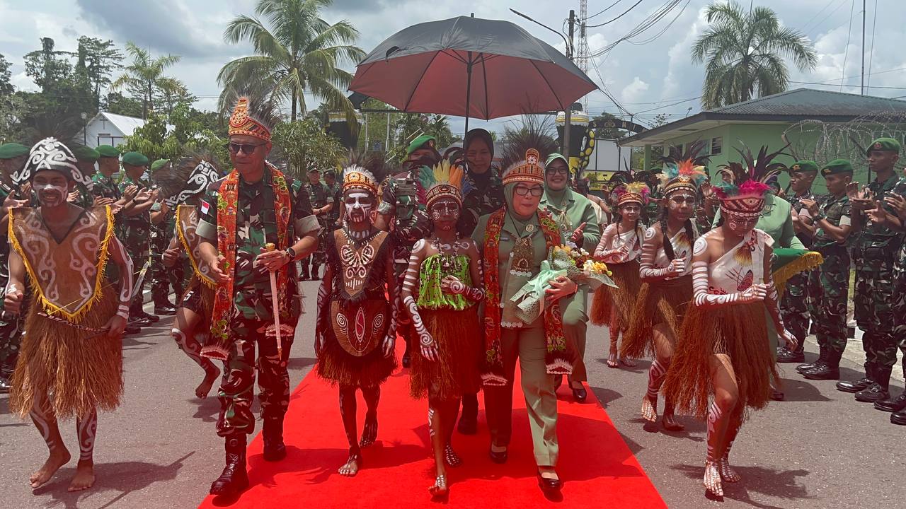 IPNews. Timika. Dandim 1710/Mimika Letkol Inf M. Slamet Wijaya, S.Sos. M.Han,.M.A. sambut kedatangan Pangdam XVII/Cenderawasih Mayjen TNI Amrin Ibrahan, S.I.P beserta Ibu saat melaksanakan kunjungan kerja ke Kodim 1710/Mimika, Senin (20/10/2025).