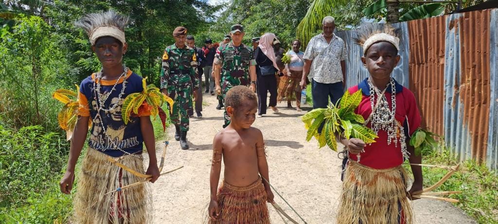 Kedatangan Danrem yang didampingi Kolonel Inf Irvan Yusri, SIP. (Kasi Ops Korem 174/ATW), Kolonel Inf Lambert J Mailoa (Kasi Ter Kasrem 174/ATW), Sermadatar Ayub Gebze, disambut oleh Ketua LMA Suku Marori Men Ngge dan masyarakat Kampung Wasur serta siswa-siswi SD Negeri Wasur 1.