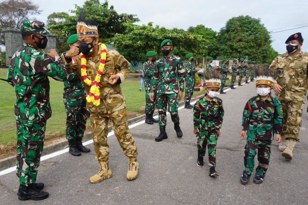 Saat kunjung kerja di Detasemen Zeni Tempur (Denzipur) 11/MA, Komandan PMPP TNI beserta rombongan menerima jajar kehormatan dan disambut dengan tarian adat.