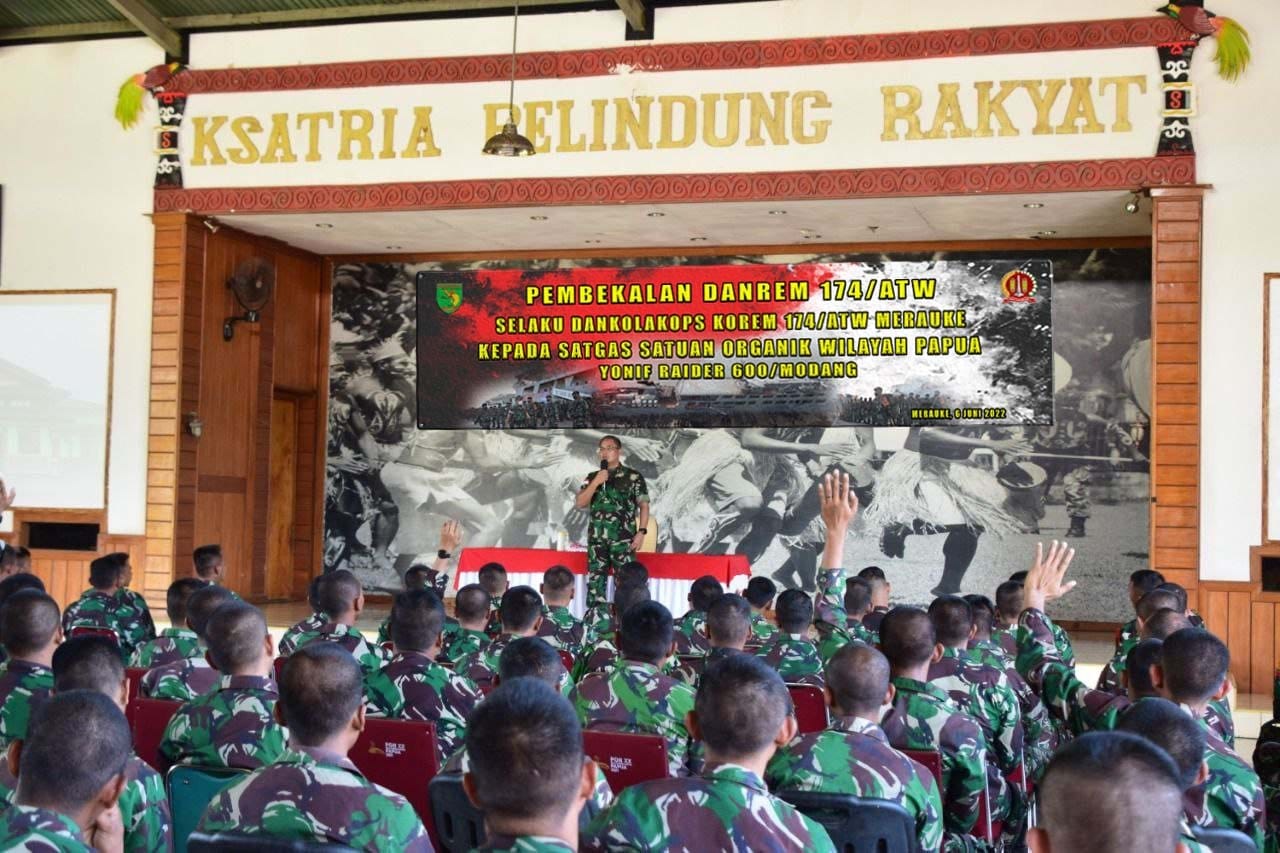 IPNews. Merauke. Satgas satuan organik wilayah Papua Yonif Raider 600/Modang menerima pembekalan dari Danrem 174/ATW Brigjen TNI E. Reza Pahlevi, SE selaku Komandan Komando Pelaksana Operasi (Dankolakops) Korem 174/ATW, di Aula L.B. Moerdani Makorem 174/ATW Merauke, Papua, Senin (6/6/2022).
