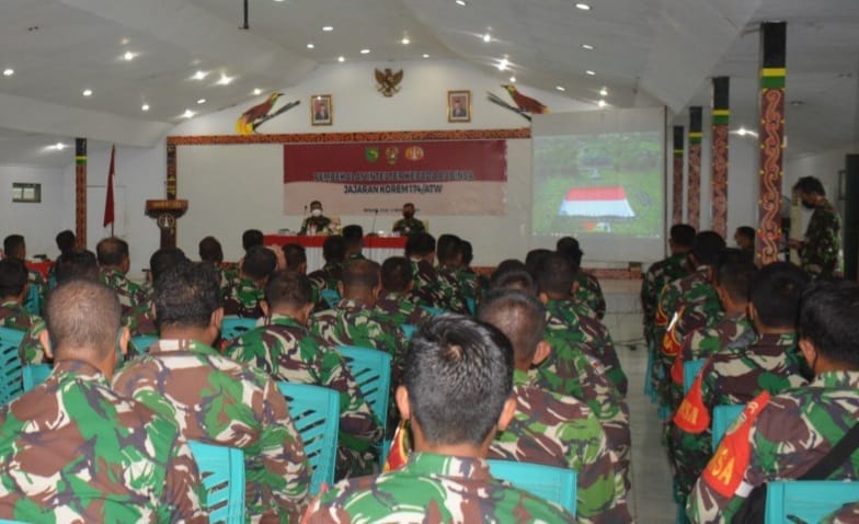 Danrem 174/ATW Merauke Brigjen TNI Bangun Nawoko dalam sambutannya yang dibacakan Kasrem 174/ATW Kolonel Arh Hamim Tohari, M.A pada Penutupan Pembekalan Intelter,Sabtu,(13/11/21) ,mengutarakan,” diharapkan para Babinsa dapat meningkatkan kemampuan Intelijen dalam rangka cegah dini dan deteksi dini dari berbagai ancaman, gangguan, hambatan dan tantangan serta mempertajam kepekaan dalam pembinaan wilayah.