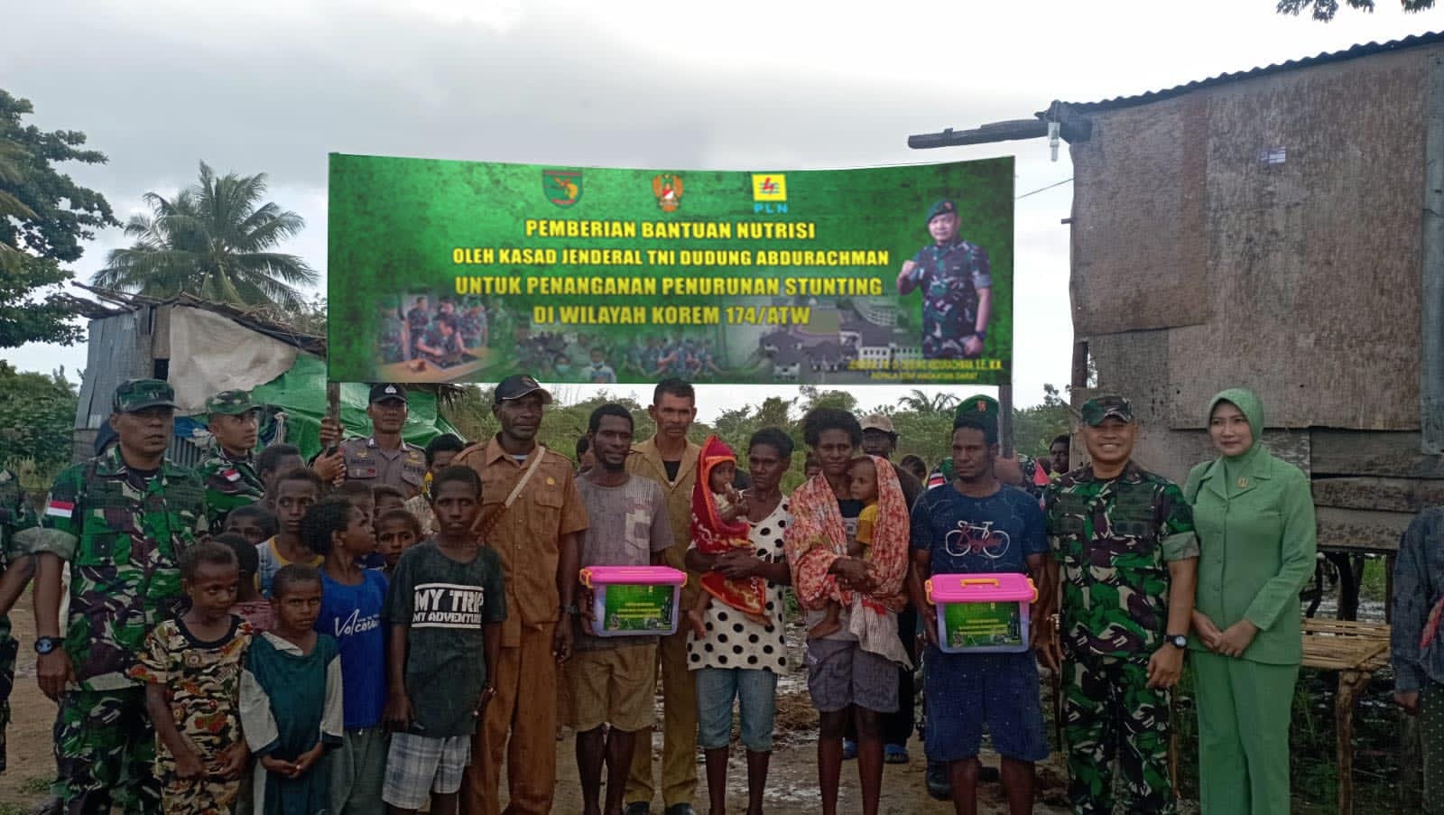 IPNews. Merauke. Anak yang mengalami stunting di wilayah Korem 174 Merauke menerima bantuan tambahan gizi yang dibagikan oleh Danrem 174/ATW Brigjen TNI Agus Widodo, SIP.M.Si., bertempat di Kampung Kamangi, Distrik Tanah Miring, Kabupaten Merauke, Papua Selatan, Rabu (8/3/2023).
