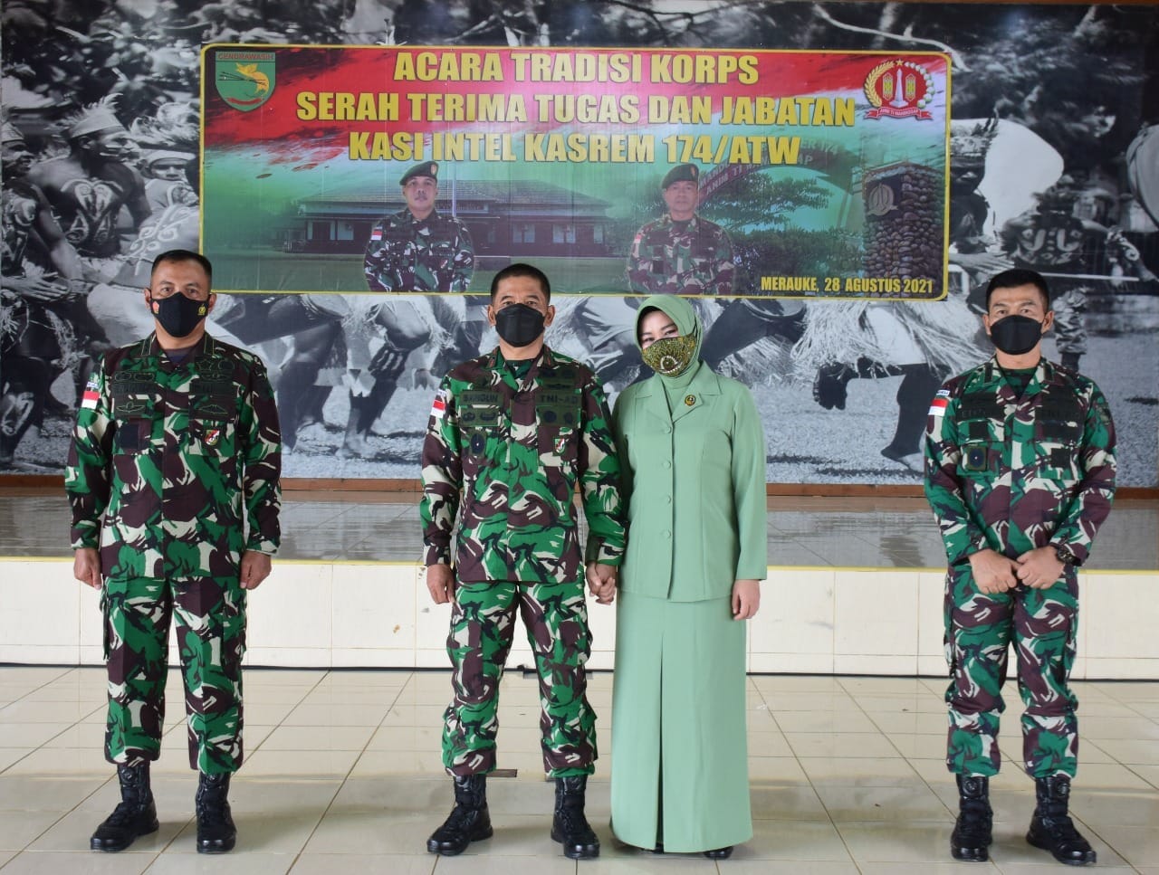 Diawali dengan Tradisi Korps penyambutan dan penerimaan pejabat Kasi Intel baru dipimpin langsung Danrem 174 Merauke didampingi Ny. Renny Bangun Nawoko dan disaksikan para Kasi Korem, Dansat Disjan, para Kabalakrem serta perwakilan Ibu-ibu Persit KCK Koorcab Rem 174 PD XVII/Cenderawasih.