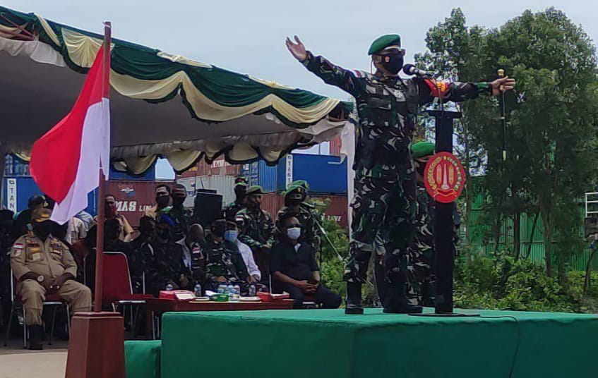 IPNews. Merauke. Danrem Merauke Brigjen TNI Bangun Nawoko selaku Komandan Komando Pelaksana Operasi (Dankolakops) Korem 174 Merauke, memimpin langsung upacara kedatangan pasukan Satuan Tugas Pengamanan Perbatasan (Satgas Pamtas) RI-PNG di Dermaga Pelabuhan Laut Yos Sudarso Merauke, Kel. Maro, Distrik Merauke, Kab. Merauke, Selasa (2/2/2021).