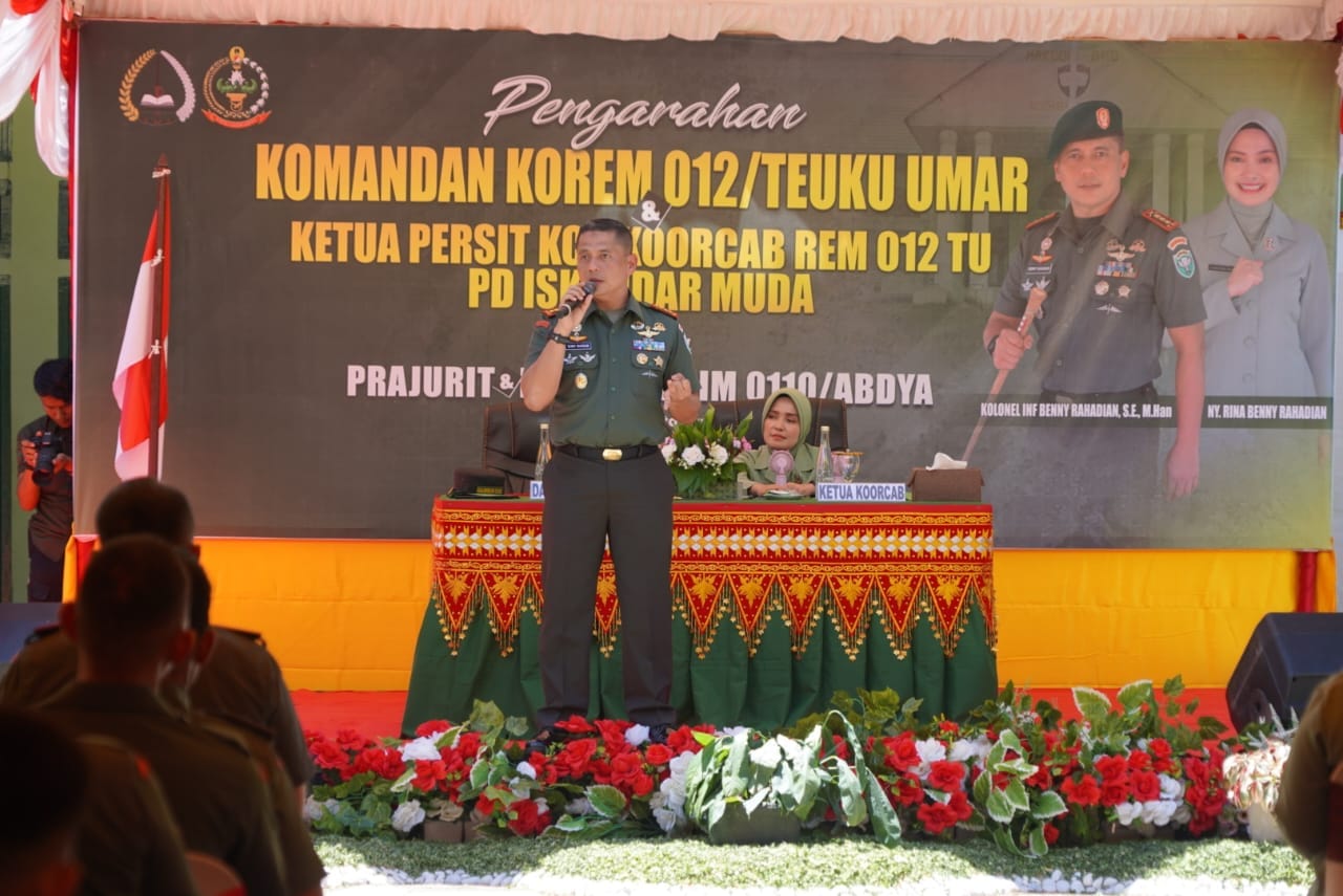 IPNews. Jakarta. Komandan Korem (Danrem) 012/Teuku Umar Kolonel Inf Benny Rahadian, S.E., M.Han mengajak seluruh prajurit dan Persit di lingkungan Kodim 0110/Abdya untuk tetap senantiasa bersyukur kepada Tuhan YME dan enjoy dalam bertugas. Ajakan ini disampaikan Danrem Benny saat memberikan pengarahan kepada prajurit dan Persit dalam agenda kunjungan kerja di Kodim 0110/Abdya, Selasa (22/10/2024).