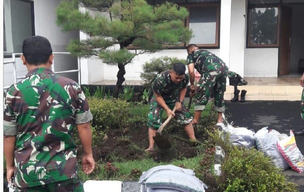 IPNews. Bandung. Kogartap II/Bandung, anggota Detasemen Markas (Denma) Komando Garnisun Tetap (Kogartap) II/Bandung memperindah pemandangan lingkungan salah satunya mempercantik membuat taman di halaman perkantoran, Senin (14/3/22).