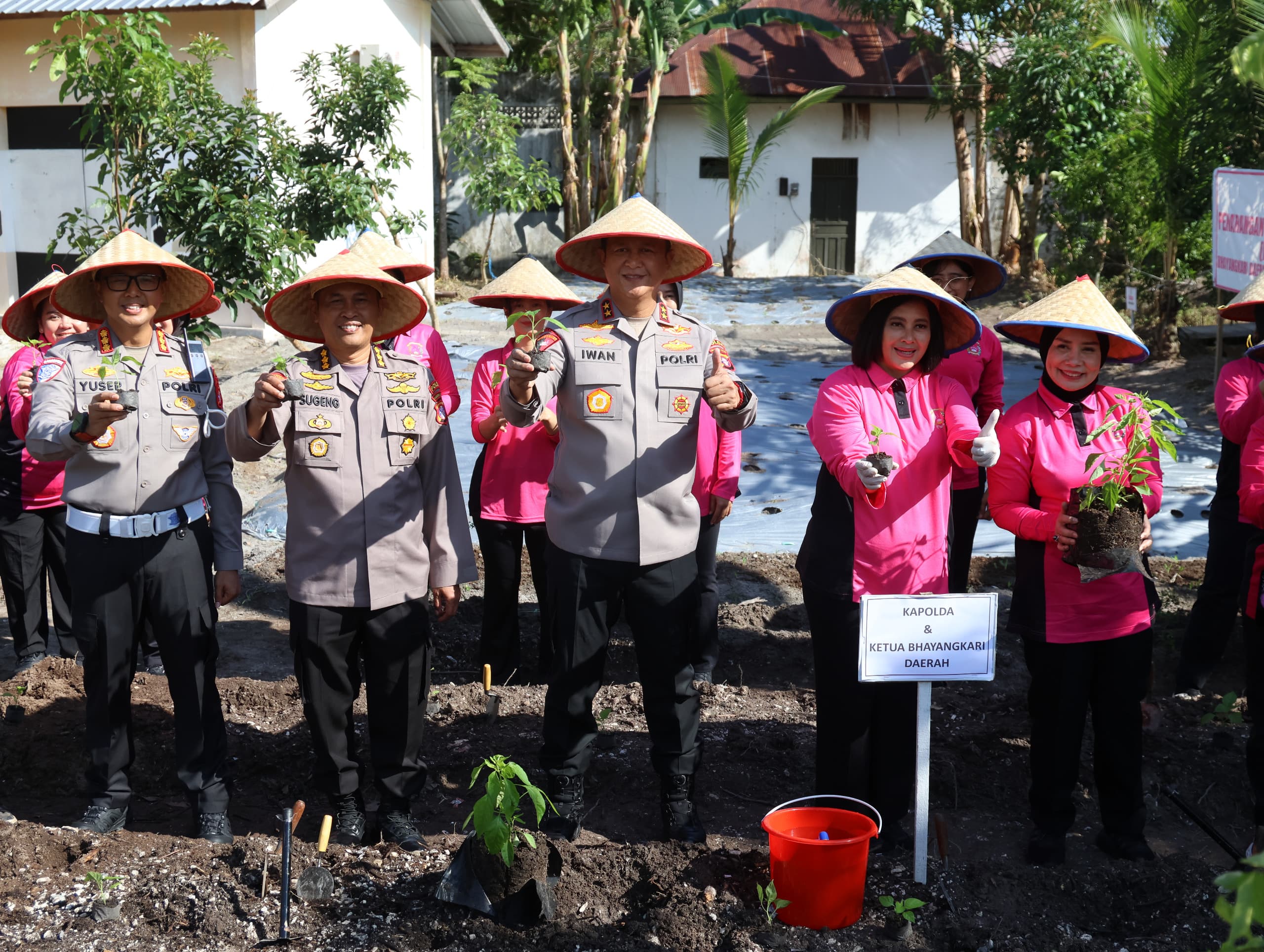 IPNews. Palangka Raya. Kapolda Kalimantan Tengah Irjen Pol Iwan Kurniawan, S.I.K., M.Si. bersama Ketua Bhayangkari Kalteng Ny. Maya Iwan Kurniawan, melaksanakan kegiatan panen sayuran di lahan Pekarangan Pangan Lestari (P2L), Mapolda setempat, Selasa (26/8/2025).