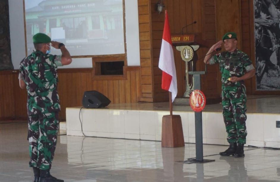 IPNews. Merauke. Menjabat Ses Dispenad Kolonel Hamim Tohari menyerahkan tugas dan jabatan sebelumnya sebagai Kepala Staf Korem (Kasrem) kepada Danrem 174 Merauke.
