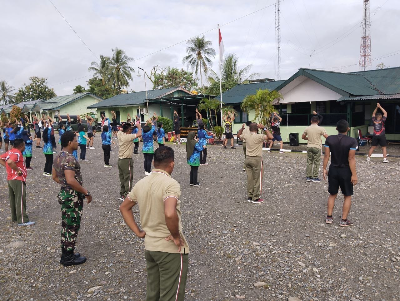 IPNews. Timika. Danramil 1710-02/Timika Kapten Inf Ahmad Zaeni bersama anggota Koramil, Persit dan Satgas Yonif R 600/ Modang melaksanakan Senam Kesegaran Jasmani dan dihadiri sekitar 80 orang, Jumat (26/05/2023). “Kegiatan tersebut dilaksanakan di lapangan Koramil 1710-02/Timika, Jalan Yos Sudarso, Distrik Mimika Baru, Kabupaten Mimika.