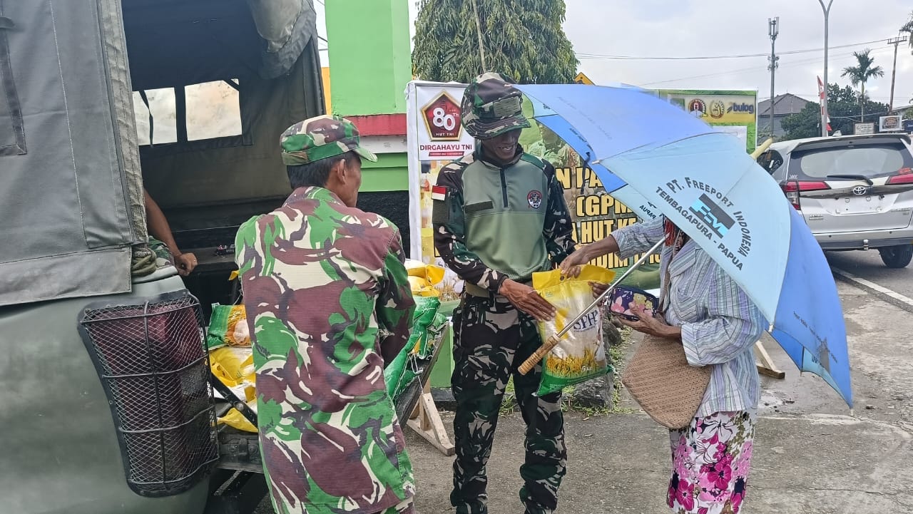 IPNews. Timika. Wujud bakti nyata jelang peringatan HUT ke-80 TNI dalam membantu menstabilkan harga beras, Kodim 1710/Mimika melalui Koramil jajaran bekerjasama dengan Perum Bulog terus melaksanakan penjualan beras SPHP untuk warga Mimika, Sabtu (27/09/2025).