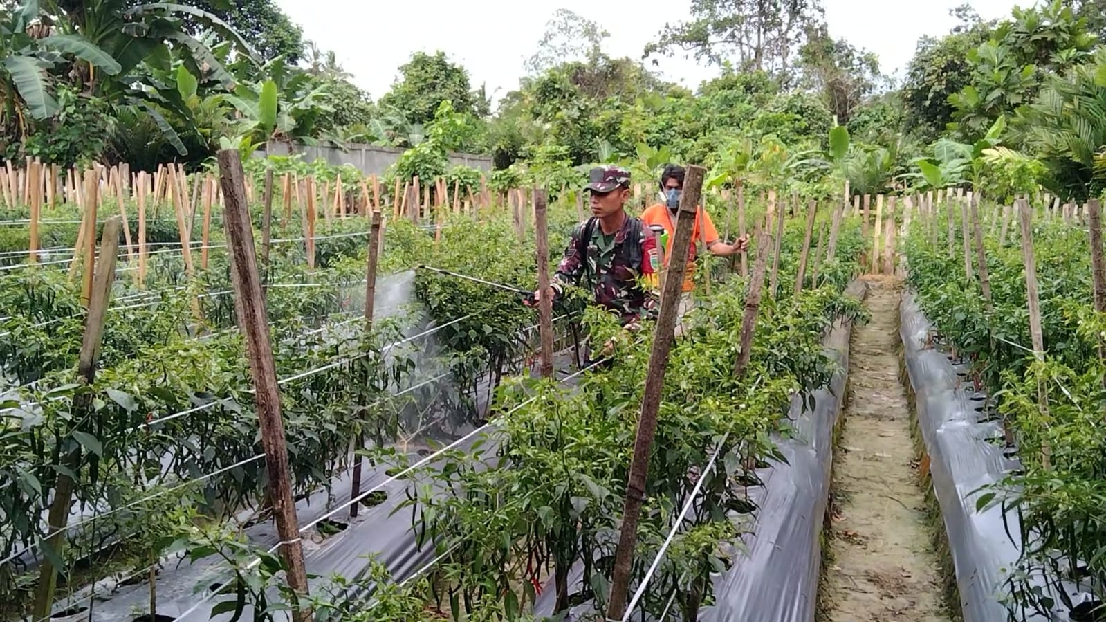 Selain melaksanakan silaturahmi, Babinsa pun menyempatkan diri membantu menyemprot cairan anti hama di lahan cabai yang saat itu sedang dirawat.