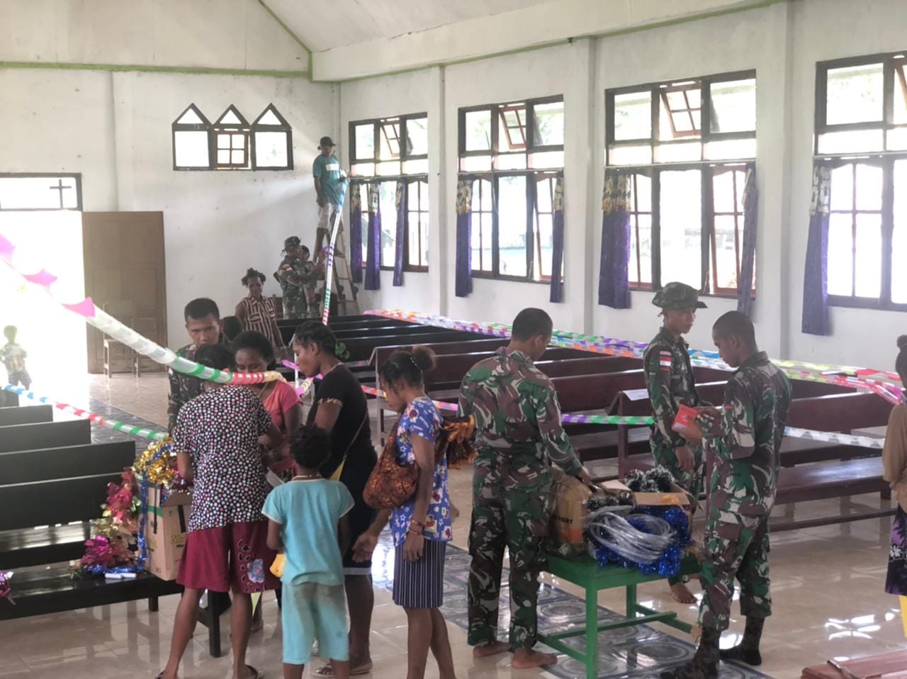 IPNews.Keerom. Menyambut perayaan hari raya Natal yang sudah semakin dekat. PErsonel Pos Yabanda Satgas Pamtas Yonif 126/KC dipimpin Serda Sion Marbun bersama jemaat mendekorasi dan mempercantik Gereja Khatolik Maranata di Desa Yabanda, Kecamatan Yaffi, Kabupaten Keerom.