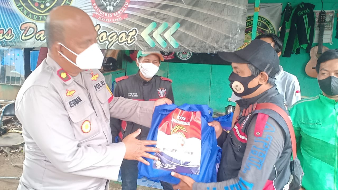 Kedatangan aparat Kepolisian itu rupanya untuk membagikan bantuan paket sembako kepada sejumlah pengemudi Ojol Lintas Daan Mogot.