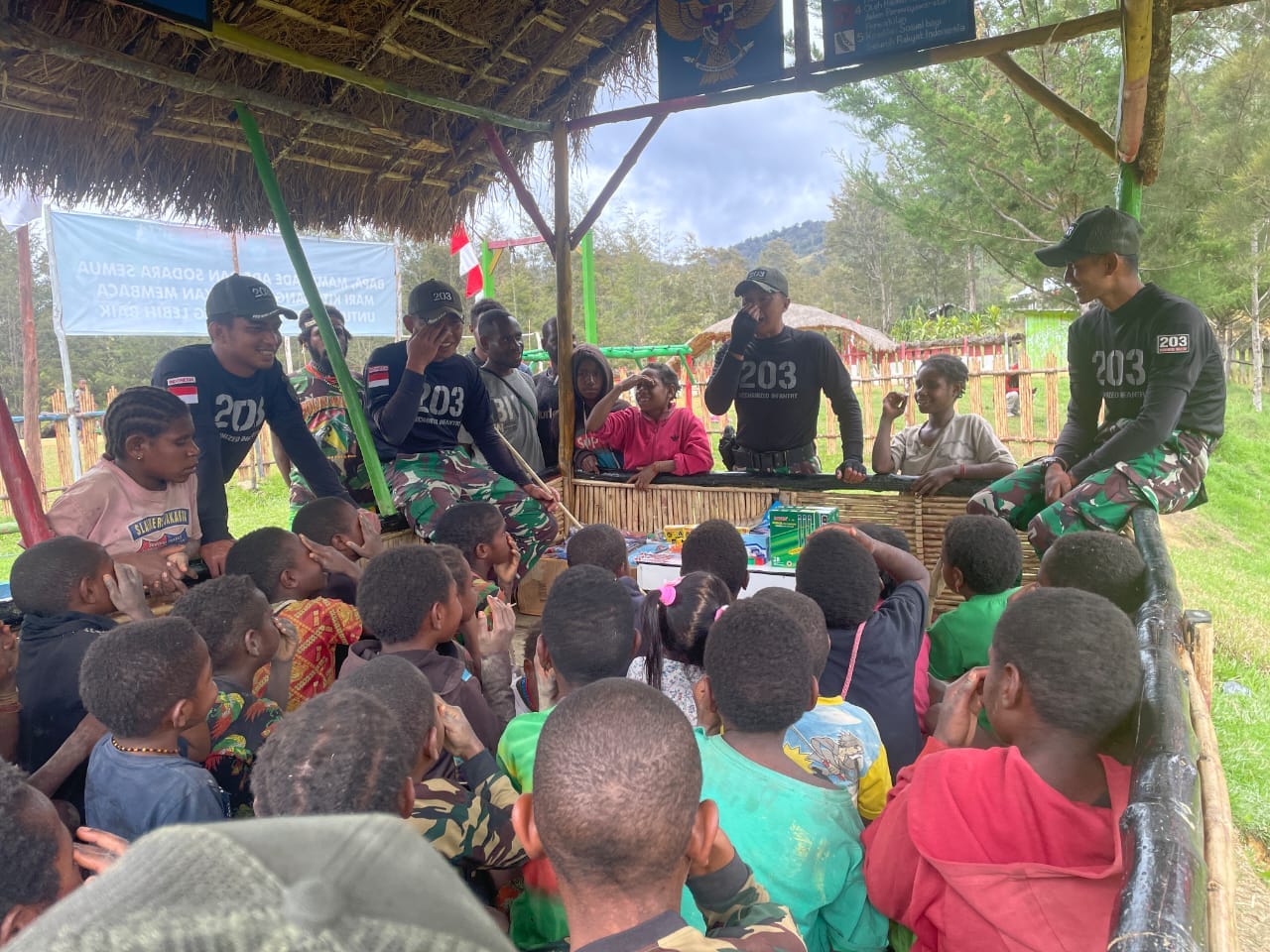 IPNews. Lanny Jaya. Tawa dan keceriaan terpancar dari raut wajah anak-anak Pegunungan Tengah bersama personel Satgas Yonif Mekanis 203/AK dalam kegiatan yang di selenggarakan di Honai Pos Malagay Distrik Malagay, Kabupaten Lanny Jaya, Kamis (5/1/2023).