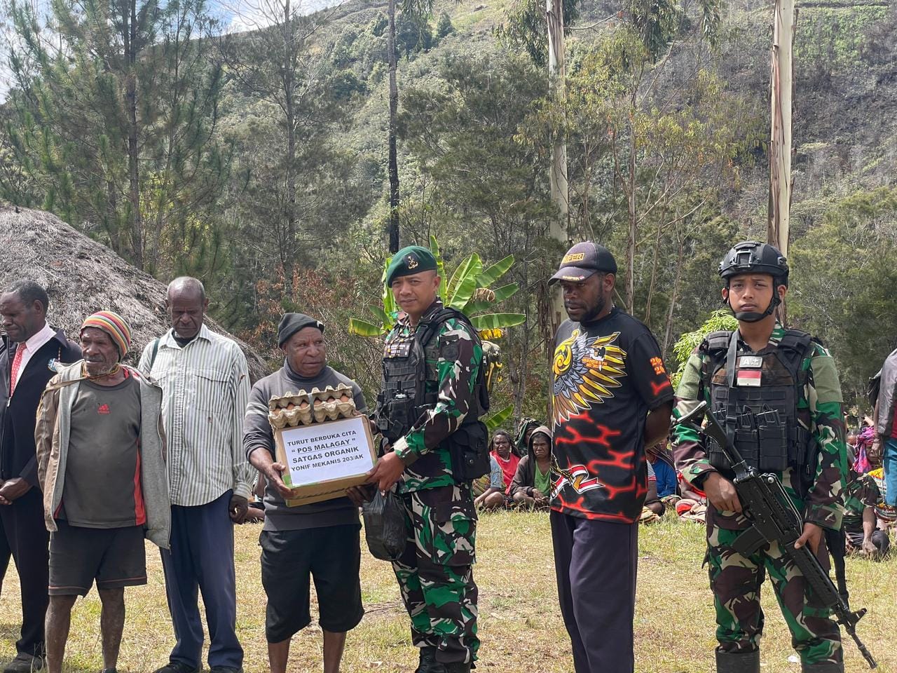 IPNews. Lanny Jaya. Rasa kepedulian Satgas Yonif Mekanis 203/AK dengan memberikan sedikit bantuan sembako berupah beras, mie dan telur serta kopi kepada keluarga Bapak Kelatar Kiwo yang sedang berduka karena salah satu sudaranya meninggal dunia di Distrik Malagay, Kabupaten Lanny Jaya, Kamis (13/10/2022).