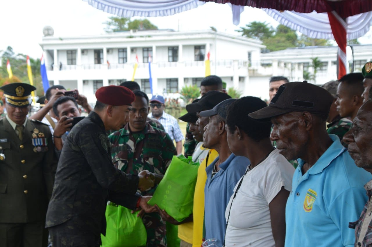Sekitar 350 paket sembako dibagikan kepada warga masyarakat yang hadir menyaksikan pelaksanaan Upacara HUT Ke-78 TNI. Turut hadir pada kegiatan ini diantaranya Brigjen TNI Murbianto Adhi Wibowo (Kasatgas Elang IV), Letkol Inf Raden Yoga Raharja, S.E., M.M., M.I.Pol. (Danbrigif 20/IJK), Letkol Inf Dedy Dwi Cahyadi (Dandim 1710/Mimika), Letkol Pnb Slamet Suhartono (Danlanud YKU Timika), Letkol Laut (P) Apriles Lusien S., M.Han. (Danlanal Timika), AKBP I Gede Putra, S.H.,S.I.K, (Kapolres Mimika), Letkol Lek Hadi P. Doly Palangdongan (Dansatrad 243 Timika), AKBP Boy Siregar, S.I.K., (Dansatgas Amole 2), Mayor Inf Cecep Cahyadi (Danyon R 754/ENK), Mayor Inf Abdul Munir (Kasdim 1710/Mimika), Kompol Dion Fox Dey Parlon, S.H., S.I.K (Danyon B Brimob Mimika dan Kapten Kav Dedy Soeharto David (Dandenkav-3/SC). (Pen/Tim)