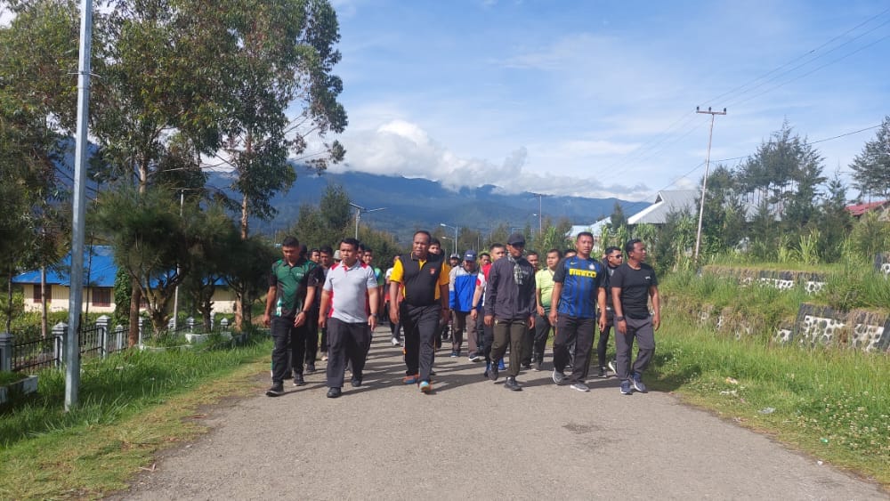 IPNews. Puncak Jaya. Dalam rangka menyambut Peringatan HUT ke-77 TNI Tahun 2022 di wilayah Ilaga Komplek, Kabupaten Puncak Papua, Kodim 1714/Puncak Jaya menggelar jalan santai TNI-Polri dan perwakilan Pemda Puncak serta Ibu PKK Kabupaten Puncak yang dipimpin langsung oleh Kasdim 1714/Puncak Jaya Mayor Inf Inra Surya, bertempat di Koramil 1714-03/Ilaga, Kampung Kago, Distrik Ilaga, Kabupaten Puncak Papua, Selasa (04/10/2022).
