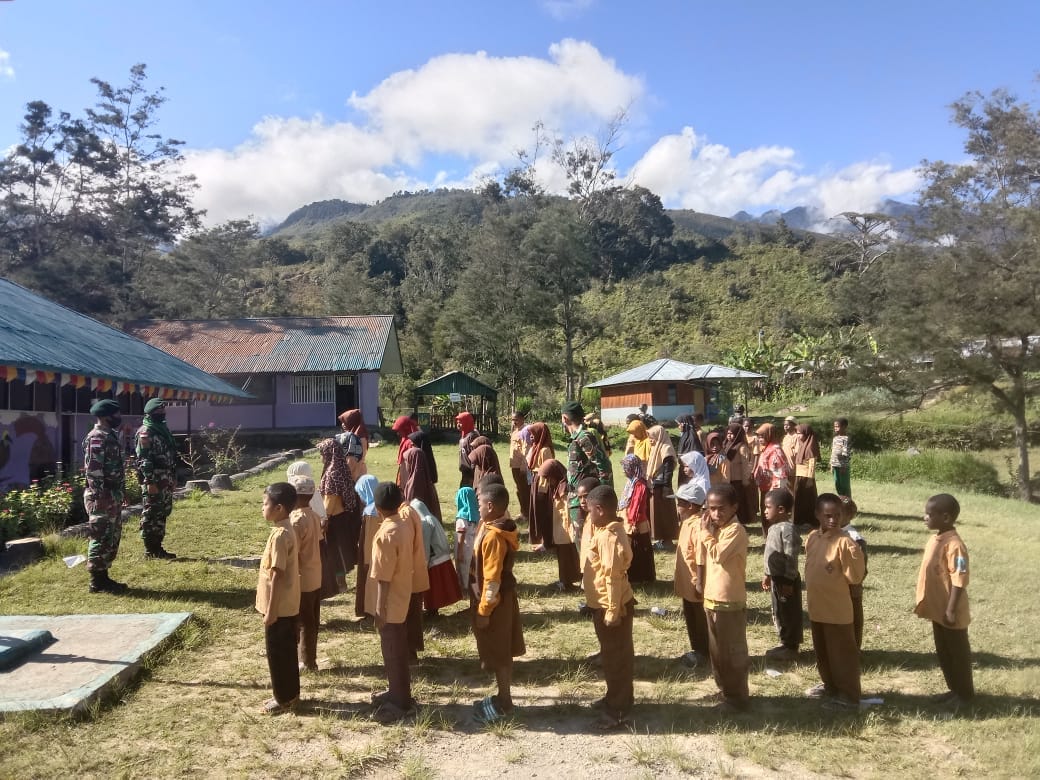 Kedatangan personel Satgas Kodim Yalimo Yonif RK 751/VJS disambut hangat oleh kepala sekolah dan mengijinkan personel pos untuk memberikan materi. Ibu Yanti mengucapkan banyak terima kasih atas kesediaan para personel Satgas yang mau mengajar PBB (Peraturan Baris Berbaris) disekolahnya.