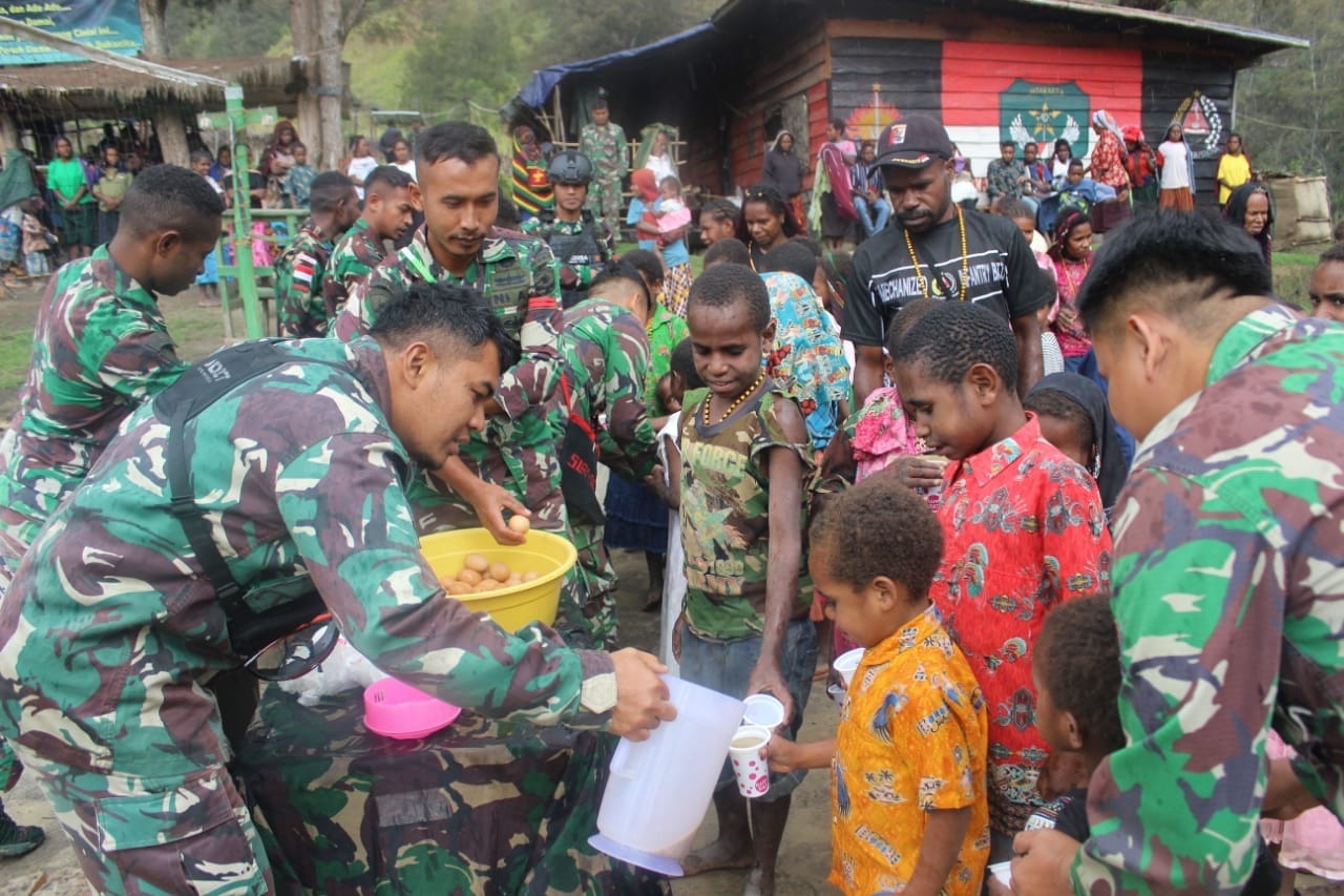 IPNews. Lanny Jaya. Satgas Yonif Mekanis 203/AK mengadakan kegiatan makan bubur kacang ijo bersama dengan anak-anak dan masyarakat Desa Tima, Kabupaten Lanny Jaya, Sabtu (31/12/2022). Kegiatan tersebut dipimpin langsung oleh Danpos Tima Lettu Inf Rio Justin, bertujuan untuk mempererat hubungan tali silaturahmi maupun memperbaiki gizi anak-anak di Desa Tima, Distrik Balingga, Kabupaten Lanny Jaya.