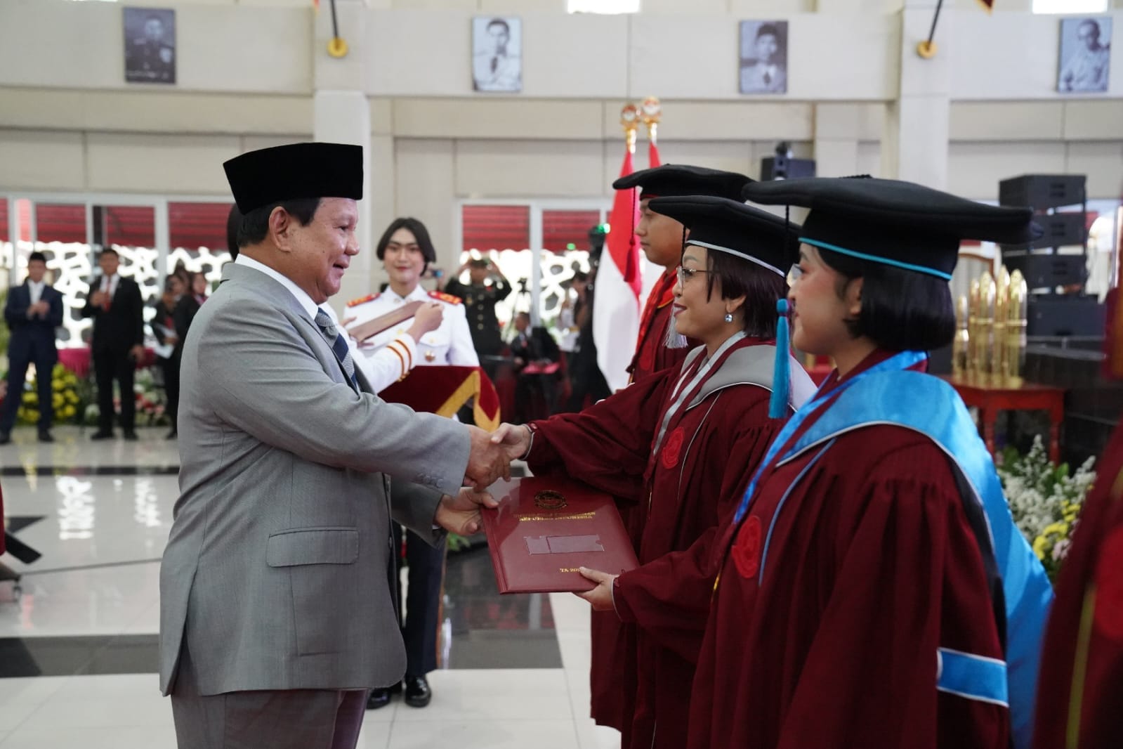 IPNews. Bogor. Menteri Pertahanan RI Prabowo Subianto menghadiri wisuda 425 Mahasiswa Unhan RI dari Program Pendidikan Diploma (D3), Sarjana (S1), Magister (S2), dan Doktor (S3) untuk Tahun Akademik 2024, di Gedung Aula Merah Putih (AMP), Kampus Utama Unhan RI, Sentul-Bogor, Jawa Barat, Sabtu (24/8/2024).