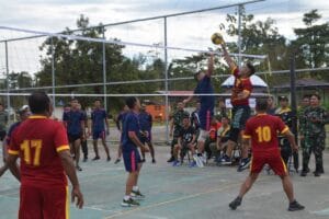 IPNews. Timika. Turnamen Bola Voli Kodim 1710/Mimika dalam rangka menyambut HUT Ke-78 Tentara Nasional Indonesia Tahun 2023 memasuki babak final yang berlangsung di Lapangan Voli Makodim 1710/Mimika, Jumat (22/9/2023). Dandim 1710/Mimika Letkol Inf Dedy Dwi Cahyadi turut langsung dalam partai final bola voli putra. Partai final mempertemukan tim Makodim 1710/Timika lawan Tim Koramil 02/Timika yang dimenangkan oleh Tim Koramil 02/Timika dengan skor 3-1.