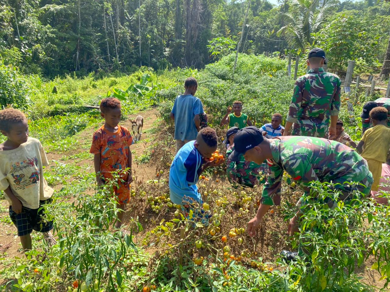 IPNews. Keerom. Berhasil dalam mengelola kebun, Personel Satgas Yonif 126/KC Pos KM 140 mengajak panen tomat dan terong serta bagikan hasil panen kepada anak-anak Kampung Monggoefi, Distrik Yaffi, Kabupaten Keerom.