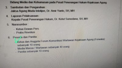 “Kalau masalah itu saya nggak tahu. Mungkin itu Nota Dinas Puspenkum ke Jamintel terkait soal rencana kegiatan tersebut. Yang pasti, panitia mengundang Forwaka hanya untuk dua media saja (Ketua dan satu orang pengurus-red),” ungkap Andrie menambahkan.