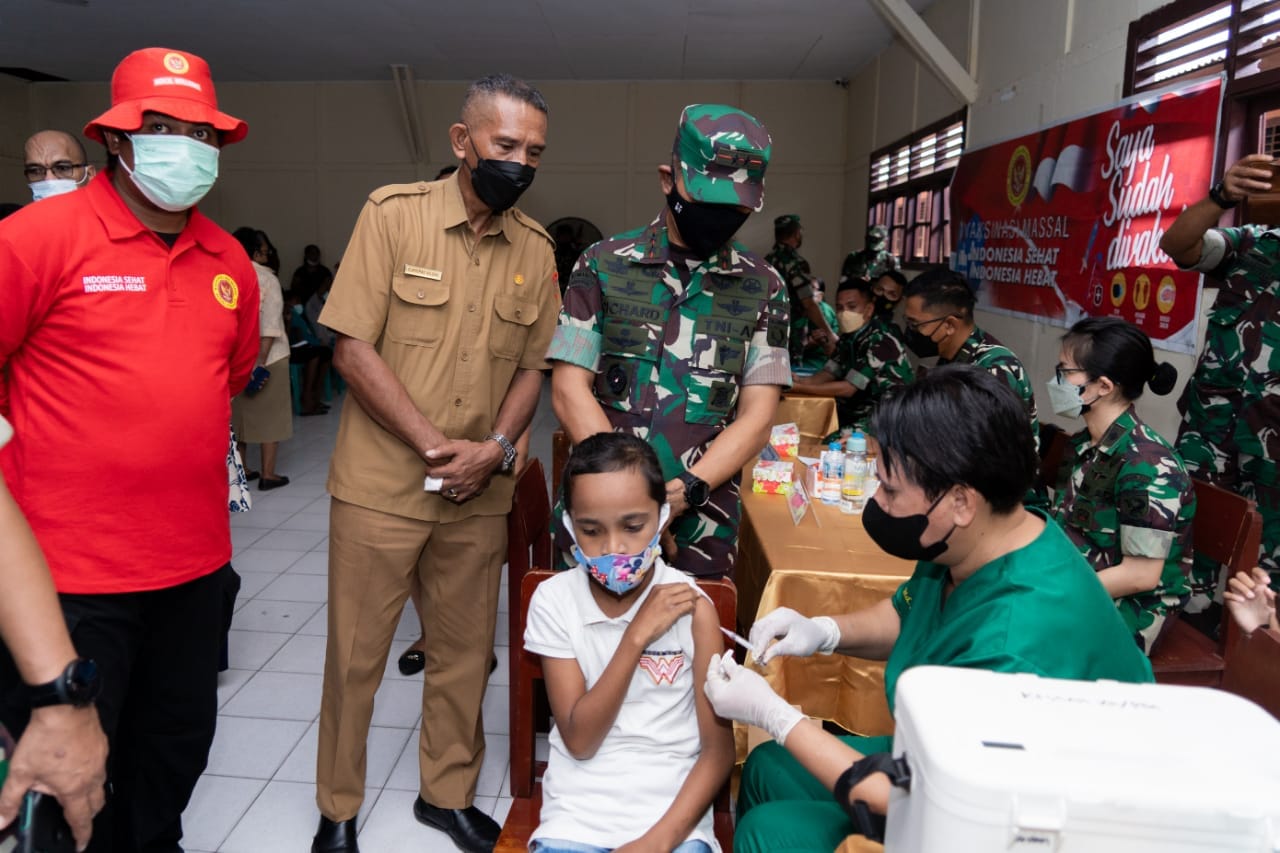 Pangdam XVI/Pattimura, Mayjen TNI Richard Tampubolon terjun langsung untuk mengecek pelaksanaan vaksinasi Covid-19 untuk anak usia 6-11 tahun, Selasa (11/01/22) bertempat di SD Xaverius dan SD Kartika Ambon.
