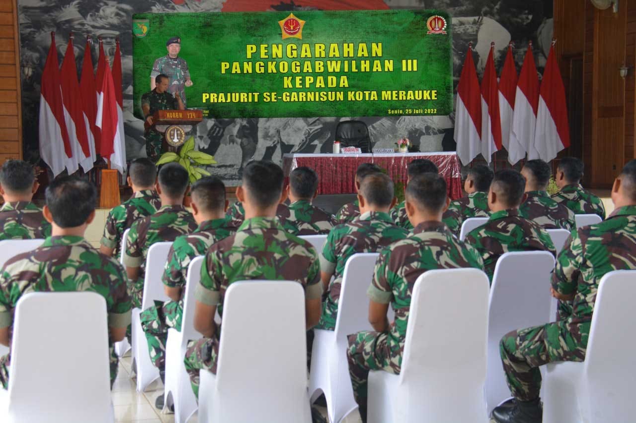 IPNews. Merauke. Panglima Komando Gabungan Wilayah Pertahanan III (Pangkogabwilhan III) Letjen TNI I Nyoman Cantiasa, SE, M.Tr(Han) memberikan pengarahan kepada para Komandan Satuan dan para Perwira TNI dari satuan TNI AD, TNI AL dan TNI AU di wilayah Kabupaten Merauke Papua, bertempat di Aula L.B Moerdani Makorem 174/ATW Merauke, Senin (25/7/2022).